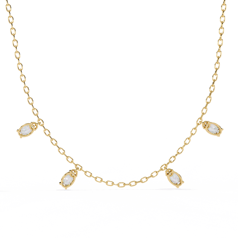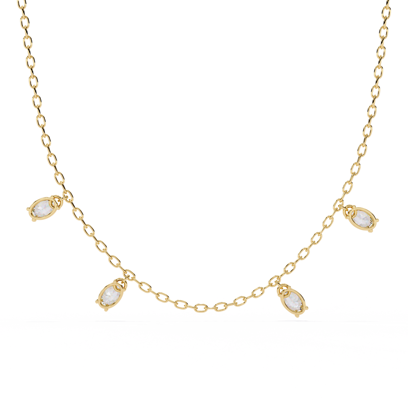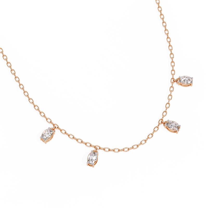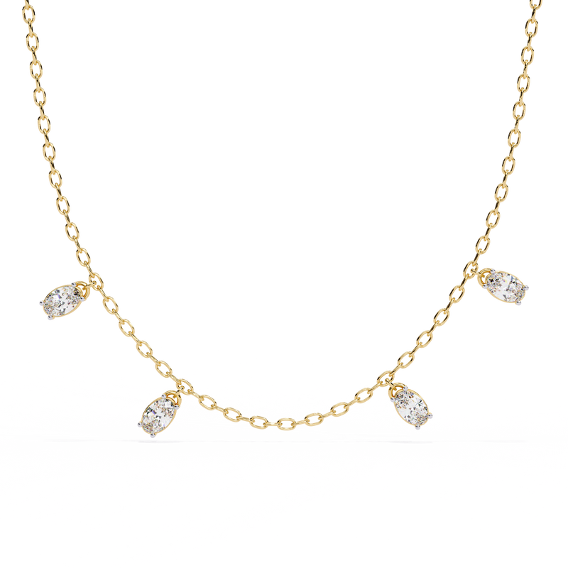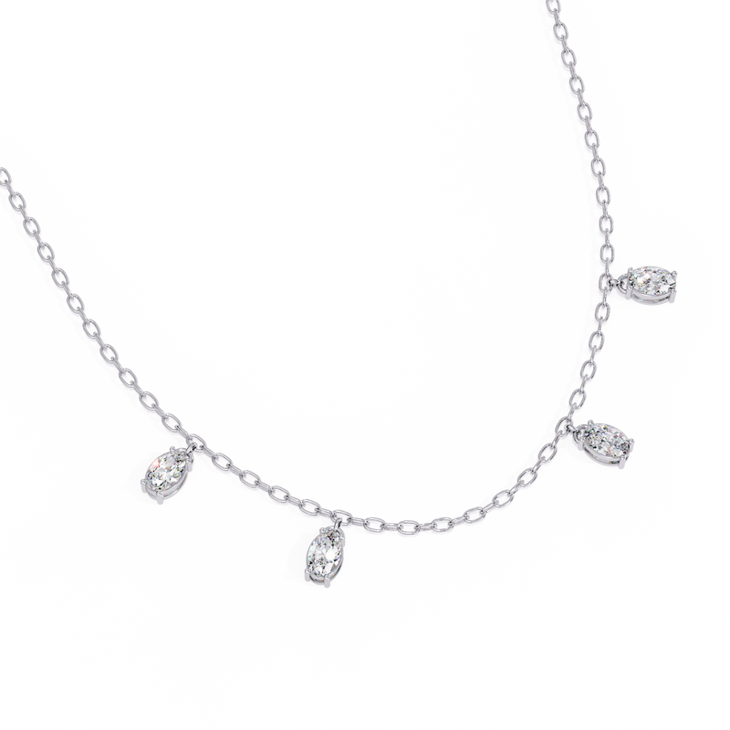Crafted with a fine, delicate chain, this elegant piece showcases stunning oval-cut diamonds arranged in a refined drop formation. The elongated oval shape enhances brilliance while creating a soft, flattering silhouette along the neckline.