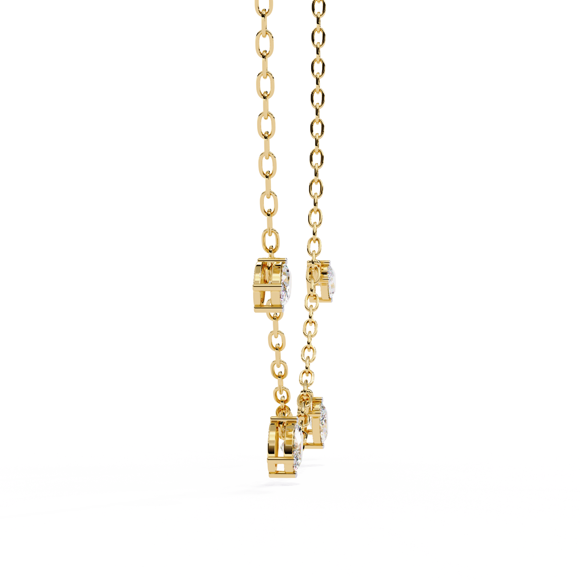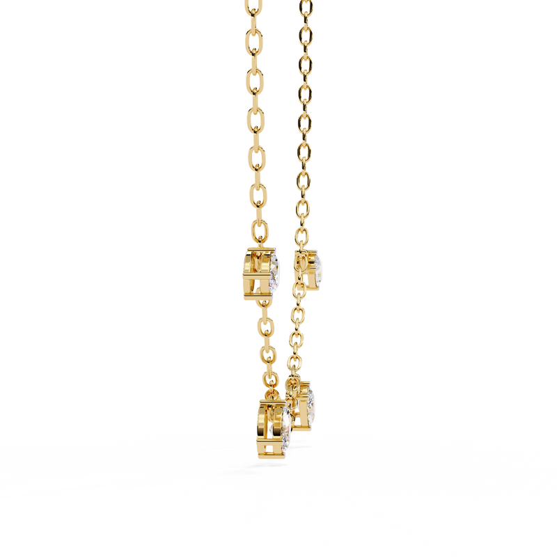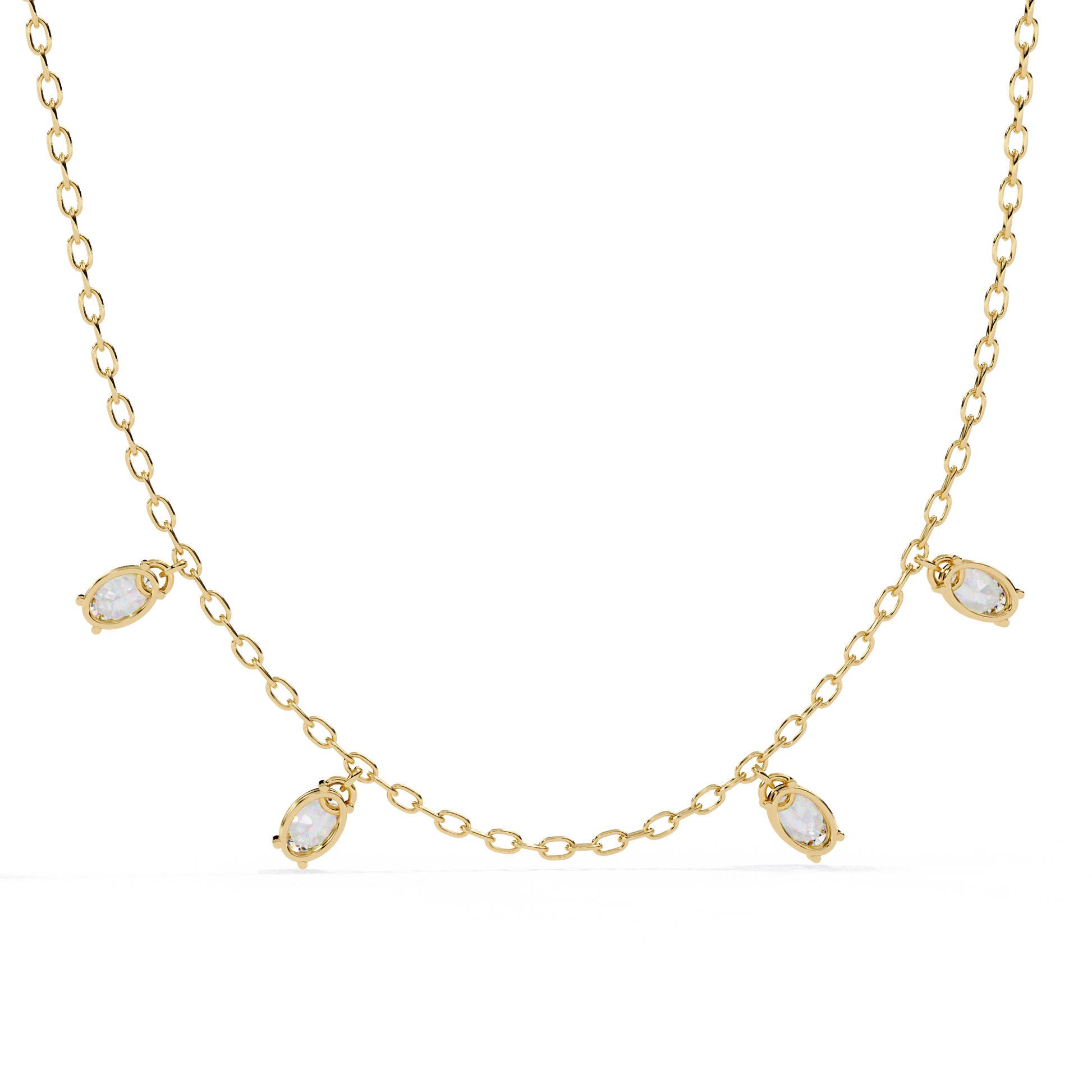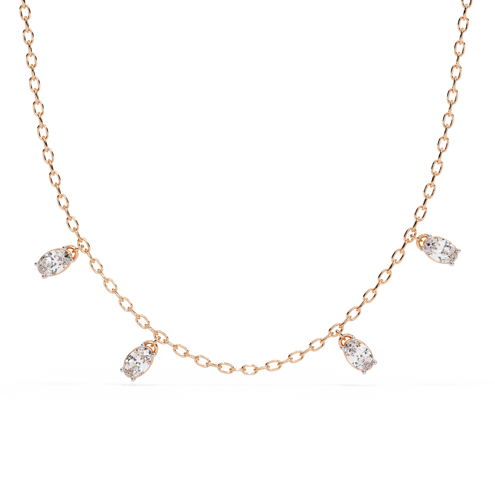 Crafted with a fine, delicate chain, this elegant piece showcases stunning oval-cut diamonds arranged in a refined drop formation. The elongated oval shape enhances brilliance while creating a soft, flattering silhouette along the neckline.