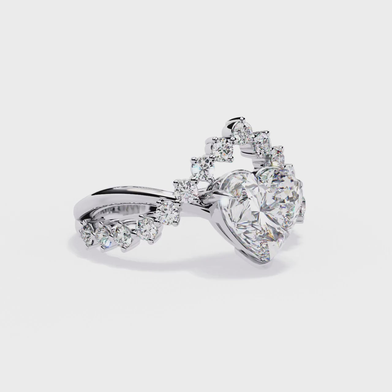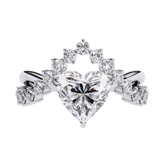 At its center sits a captivating heart-shaped diamond, symbolizing passion and devotion. Surrounding the centerpiece, smaller round brilliant-cut diamonds are arranged in a graceful tiara-inspired halo, creating a crown-like silhouette that enhances brilliance and gives the ring a regal presence.