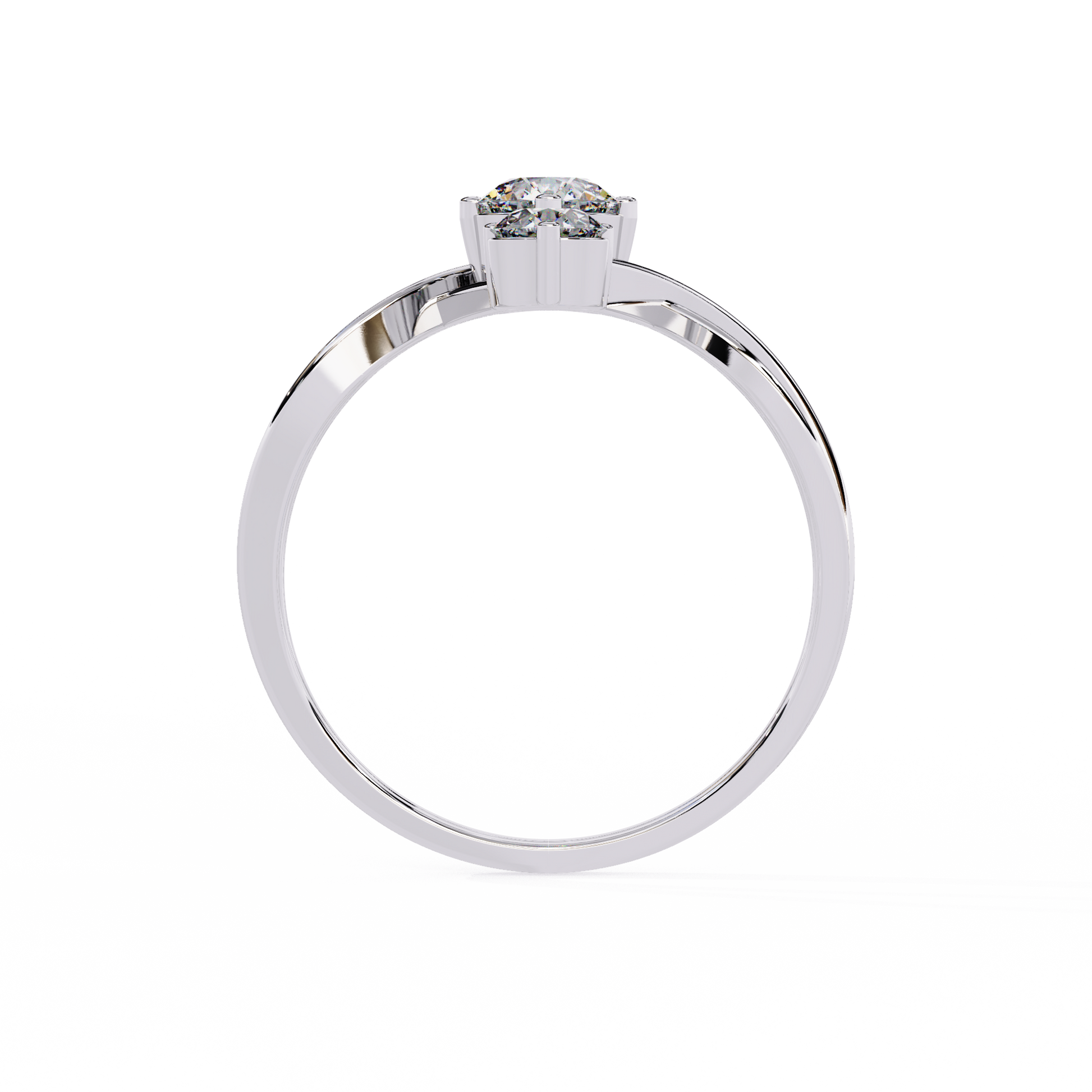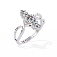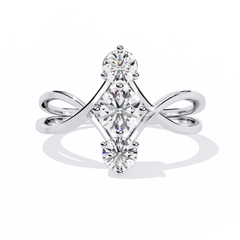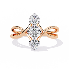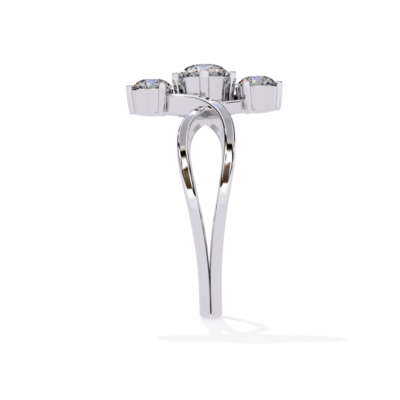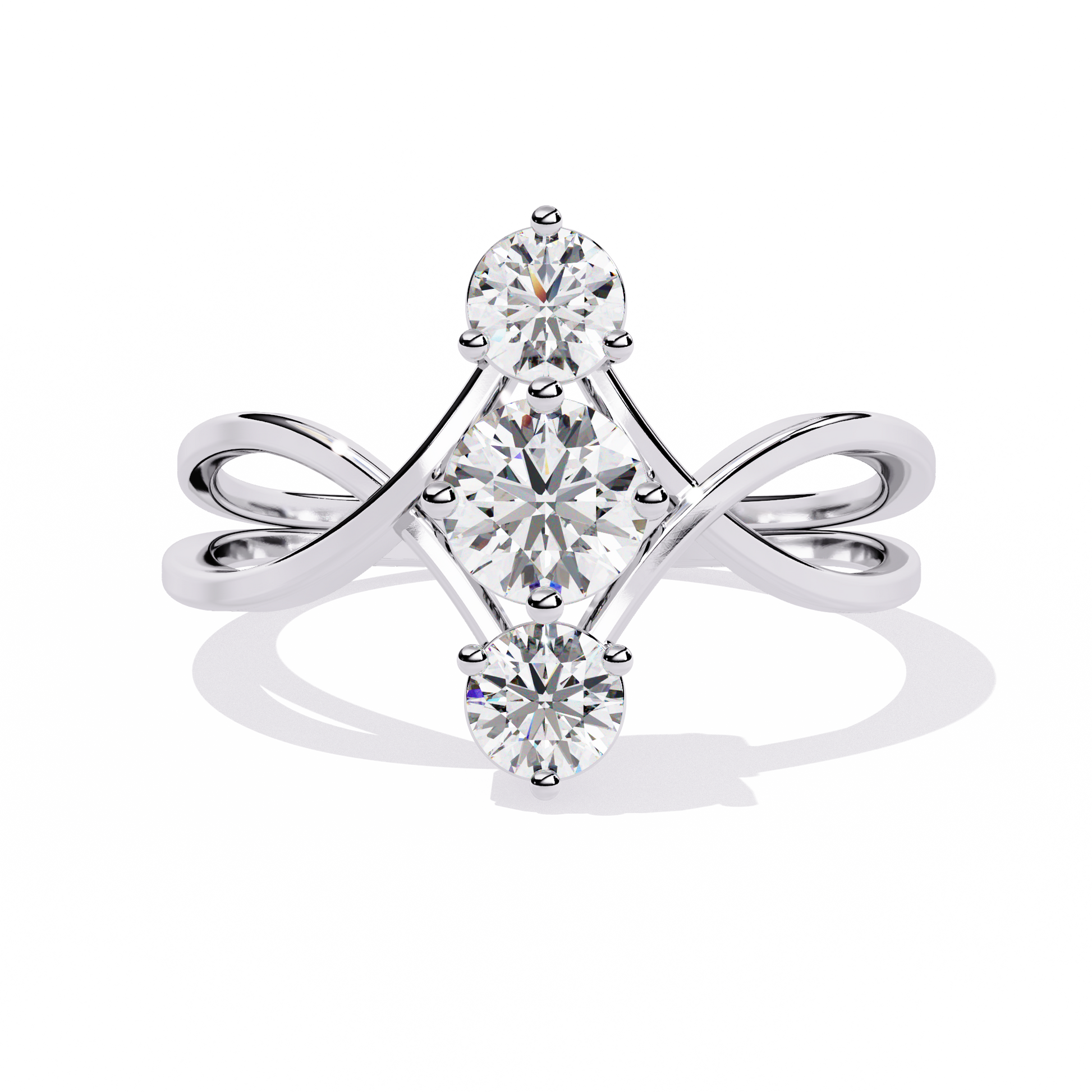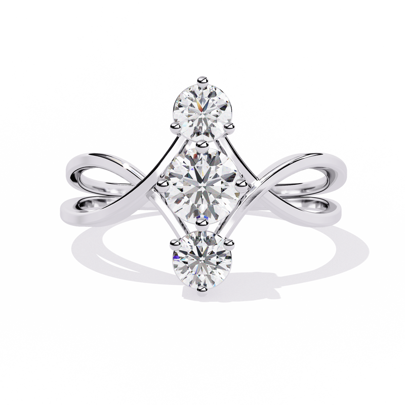 Featuring three round brilliant-cut diamonds arranged vertically, the design creates a graceful elongating effect on the finger. The intertwined criss-cross band adds dimension and modern flair while symbolizing unity and connection.